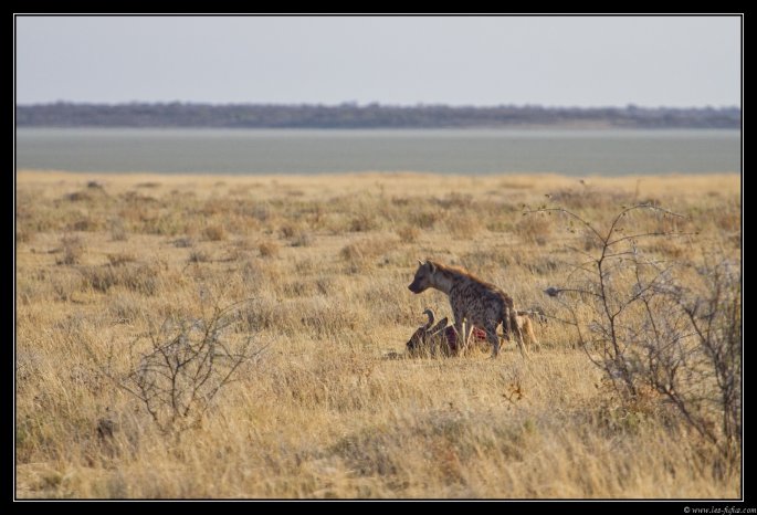 Quelques minutes plus tard, ce coup-ci c’est une hyène tacheté qui est en train de faire son festin sur une vieille carcasse.