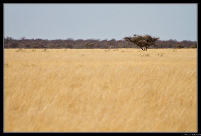 On reprend la route en longeant le pan vers l’ouest. Ce sont d’énormes étendus de savane recouvertes d’herbes courtes. On voit à des kilomètres à la ronde. Plusieurs grands troupeaux broutent.
