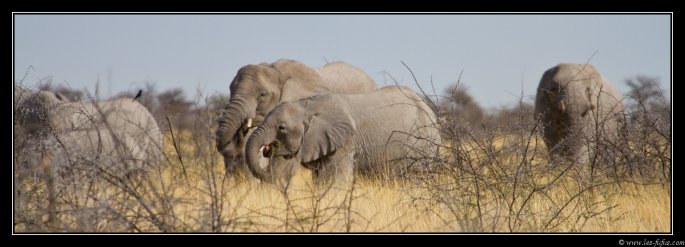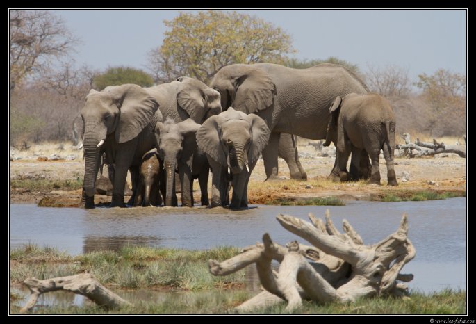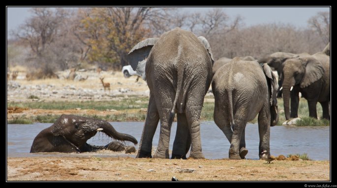 Ce point d’eau est très vaste, et les animaux y sont particulièrement nombreux. Et là, au beau milieu se trouvent une cinquantaine d’éléphant en train de jouer dans l’eau et dans la boue