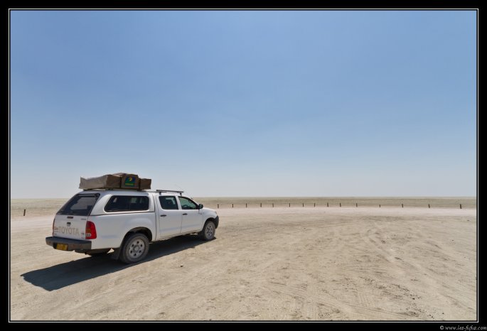 Après une bonne heure, on quitte ce point d’eau remarquable et allons en direction d’Etosha Lookout. Cet endroit n’est pas un point d’eau, mais juste un endroit où la route faite une incursion dans le pan d’Etosha. On se rend compte aussitôt de l’étendu du site. La chaleur monte de suite de plusieurs dégrées.