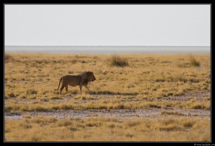 Pas grave on continue sur quelques kilomètres, avant que Sabine ne voie une tache sombre se déplaçant au loin dans l’herbe. On se rapproche, et jackpot !!! Un lion mâle solitaire !!! Et rapidement, nous nous apercevons qu’un deuxième le suit à quelques centaines de mètre