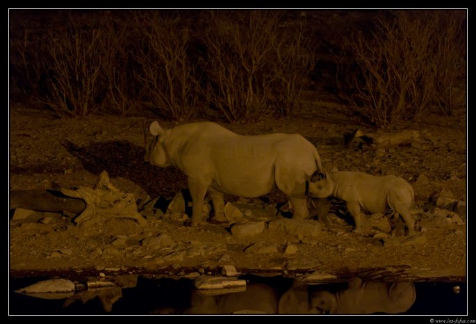 Le soir, nous nous rendons au point d’eau éclairé. Il y a un peu de monde. On attend 20 minutes, et soudainement une maman rhino noir et son bébé apparaissent dans la lumière