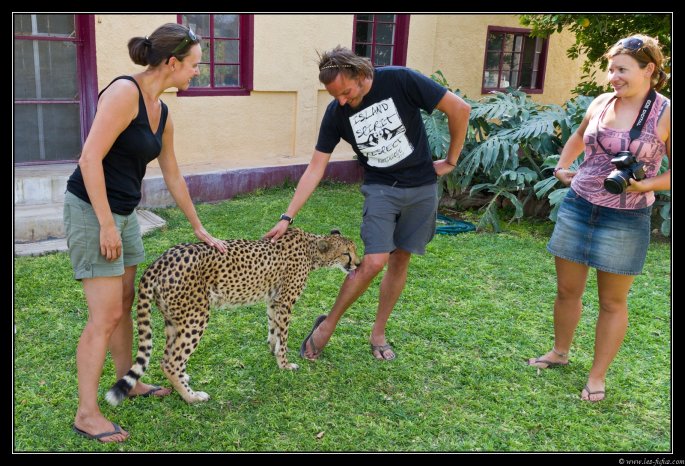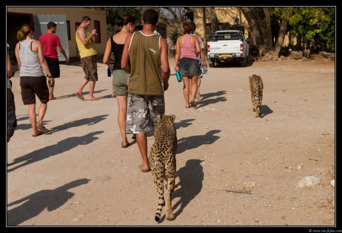 Nous sommes une bonne vingtaine de personnes en tout (le groupe d’anglophone nous ayant rejoint). Les guépards viennent de suite contre les gens. L’un d’eux me lèche les mollets (surement à cause du sel). Ca fait une impression bizarre