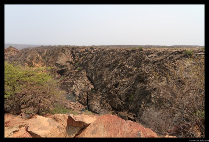 A la suite de ça, on quitte les routes bien entretenues pour s’aventurer sur des chemins un peu plus difficiles. On commence à suivre la D3700 qui longue la rivière Kunene. A dire vrai, je m’attendais à beaucoup plus de difficultés. Sur les 5 premiers kilomètres, la piste peut-être assez cabossée et assez pentue – il m’a fallu passer une fois en boite courte histoire de ne pas faire patiner l’embrayage – mais ensuite, ca roule tout seul. Nous avons tout de même dû franchir 2-3 gués, mais avec seulement 10 cm d’eau. En période de pluie, la route est certainement un peu plus difficile avec beaucoup de zone humide à traverser. Ne vous y trompez pas pour autant, cette route est exclue pour les véhicules à 2 roues motrices à cause du risque du manque de motricité, mais surtout en raison du manque de garde au sol.
