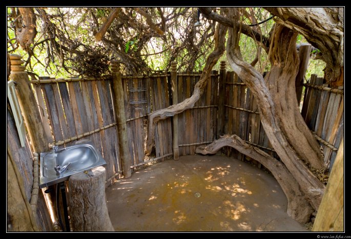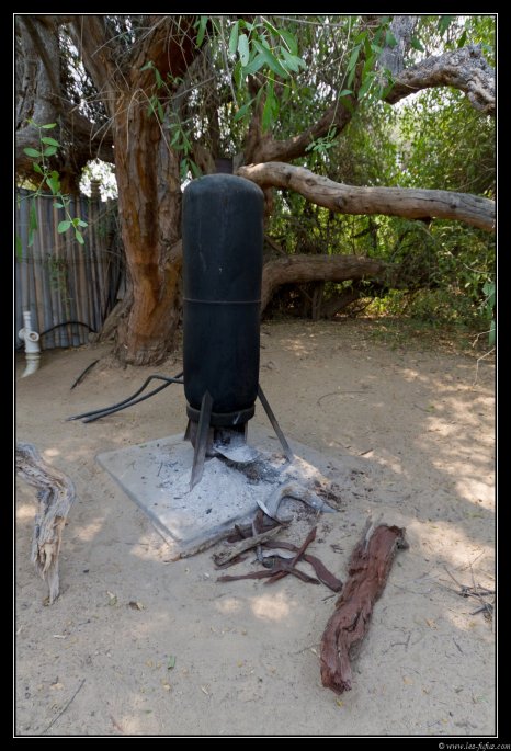 Quand au sanitaire, ils sont comme tous ceux du camping, collés contre un arbre touffu, les tuyaux d’eau utilisant les branches comme support. Le personnel du camping nous allume le feu pour avoir de l’eau chaude.