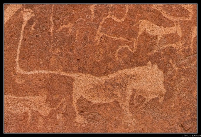 Le guide nous emmène dans un dédalle de pierre nous conduisant de rochers en rochers et vers les gravures les plus importants. De nombreux animaux y sont représentés tel que ce lion, symbole du parc