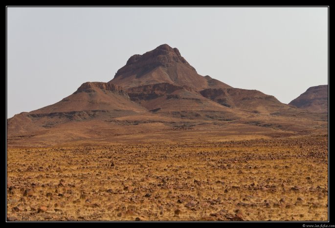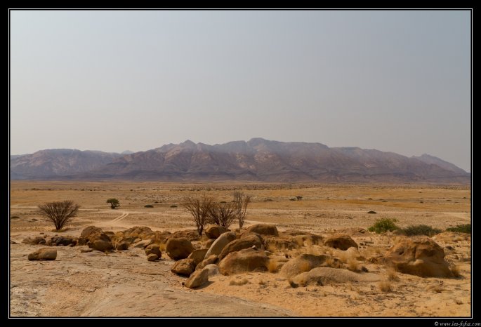 Il nous reste encore 60-70km à faire. La route est en parfait état. Nous passons entre le massif du Brandberg à notre droite et le Messum Crater à notre gauche.