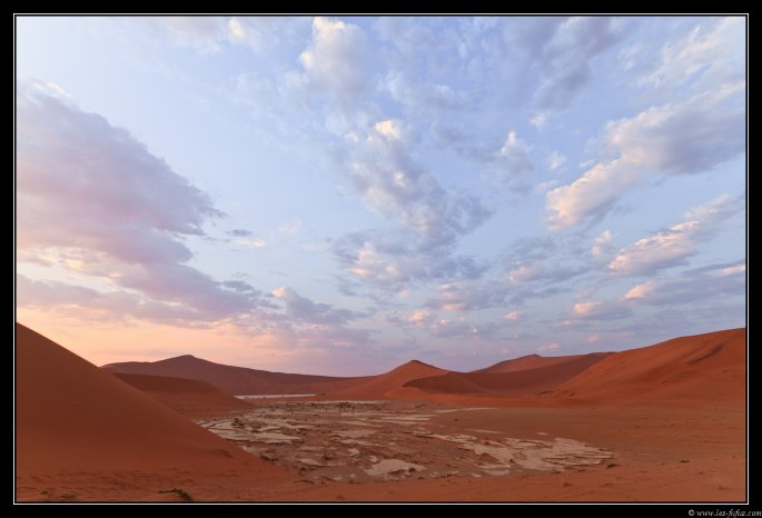 Le soleil se lève enfin au-dessus des dunes et donne naissance à de longues ombres. Le site est constitué de 2 zones asséchées. Je trouve la deuxième plus surréaliste que la première. Le sol y est parfaitement plat et craquelé.