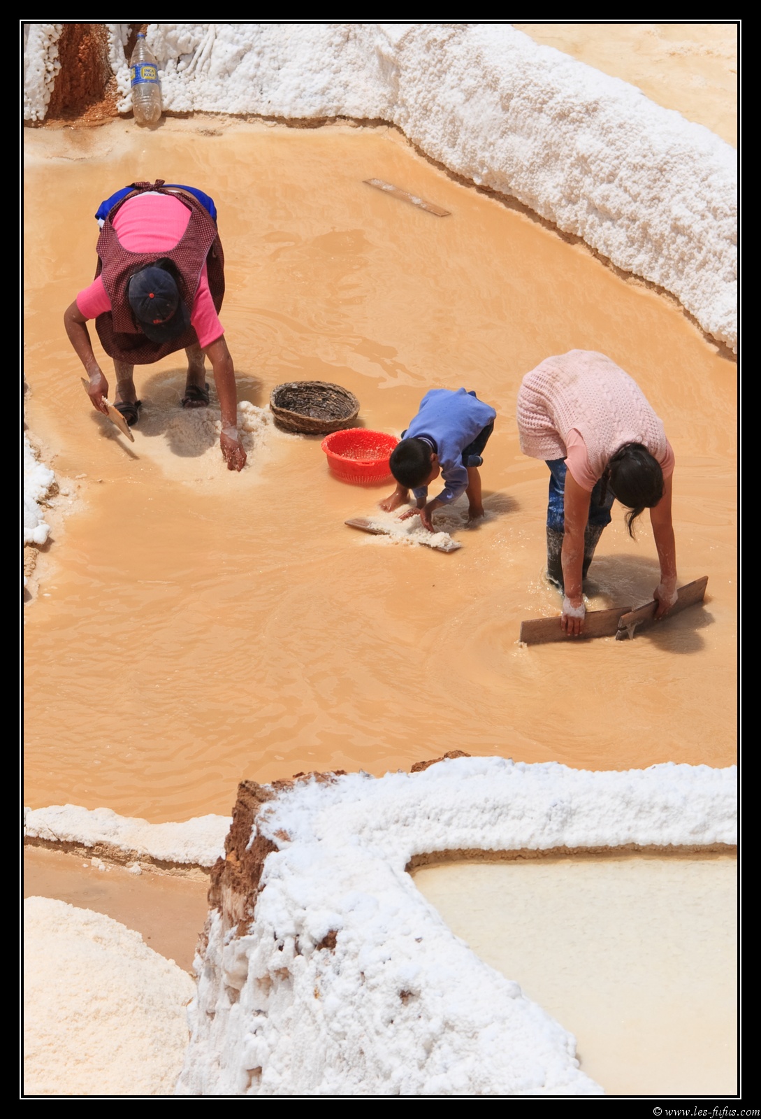 Ensuite, l’eau est répartie, bloquée, dirigée vers les différents compartiments, puis évaporée. Chaque famille possède 5-6 compartiments qu’ils exploitent comme ils veulent. Ces ballades sont toujours agréables, le mélange des couleurs, du blanc, de l’ocre, etc… me plait à chaque fois.