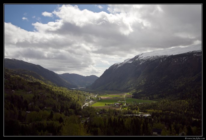 Je reprends ma route et m’élance sur la vallée de Setesdal sur une route rapide, encadrée par 2 falaises. J’arrive au village de Brokke. J’avais prévu de bifurquer ici, mais la route que j’avais planifiée est encore fermée par la neige. C’est la raison pour laquelle je dois faire une longue étape, parce que le détour rallonge mon parcours de 100 à 150km.