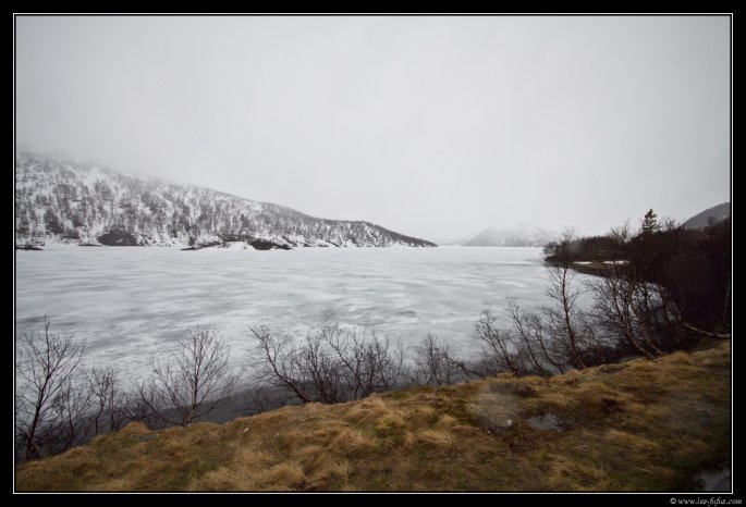 et je me rends à Holtebru. Ma route monte rapidement pour rejoindre un plateau : la température chute à 2°C, et j’ai droit à un mélange de neige et de grêle. Là-haut, les lacs sont encore gelés.