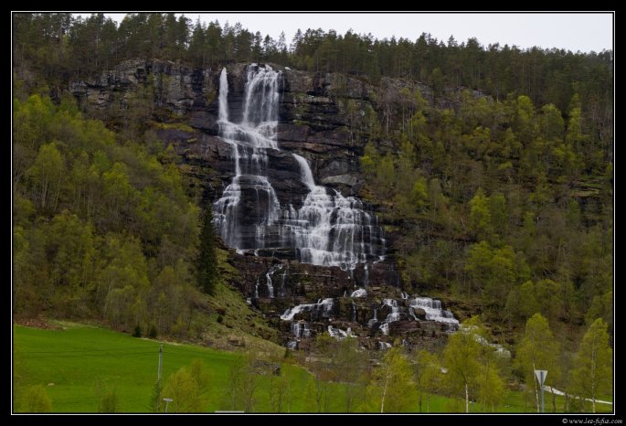 Par la suite la route s’enfonce dans les terres et les lacs se succèdent. La route comprend beaucoup de tunnel. A Voss, je pars pour le nord (toujours sur l’E16) et passe devant la cascade de Tvindefossen.