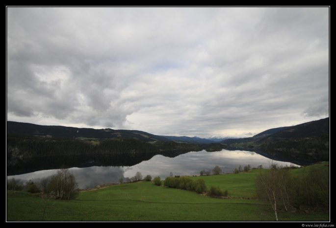 Puis je coupe à travers la montagne pour rejoindre une route mythique : la Fv51 Valdresflya (lien internet). La route monte jusqu’à un plateau et atteint 1389m d’altitude (ce qui est considérable en Norvège). La neige s’étends à perte de vue, la température chute à 2.5°C et les norvégiens se garent à l’arrache le long de la route pour aller faire du ski de fond.