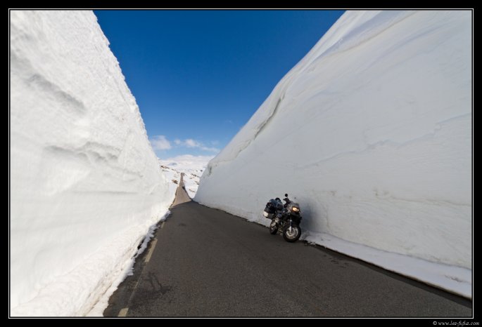 Ensuite je réattaque une autre route mythique : la Fv55 dite Sognefjellet (lien internet). Celle-ci passe le col le plus haut d’Europe du nord à 1434m. Ici aussi la neige est très présente voir en de plus grosse quantité. Des fois, ce sont des murs de neige de 5m de haut au minimum qui m’encadre.