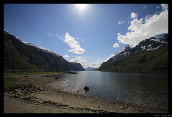 Je suis donc au niveau de la mer, au point le plus avancé du fjord Lustrafjorden. C’est magnifique avec ce soleil.