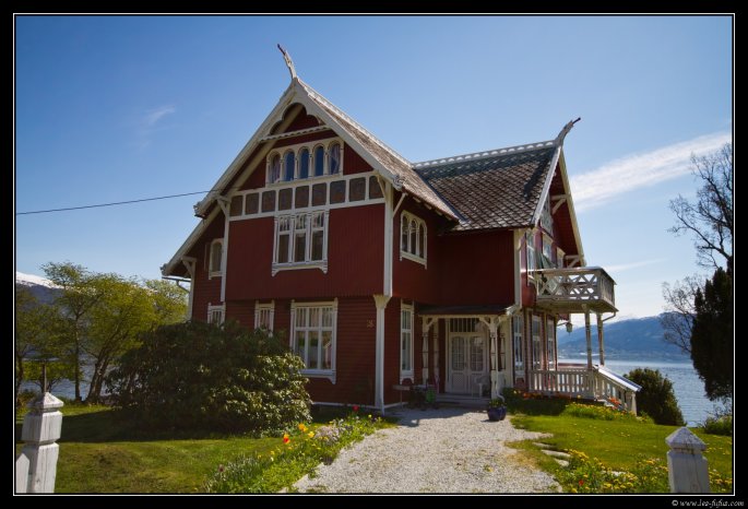 Je reviens sur mes pas et rejoins la ville de Balestrand. Cette ville est connu pour son style « Dragon ». En gros, ce sont des maisons avec de hautes fenêtres, dont les montants sont sculptés et dont les toits sont surplombés de dragons à la mode viking.