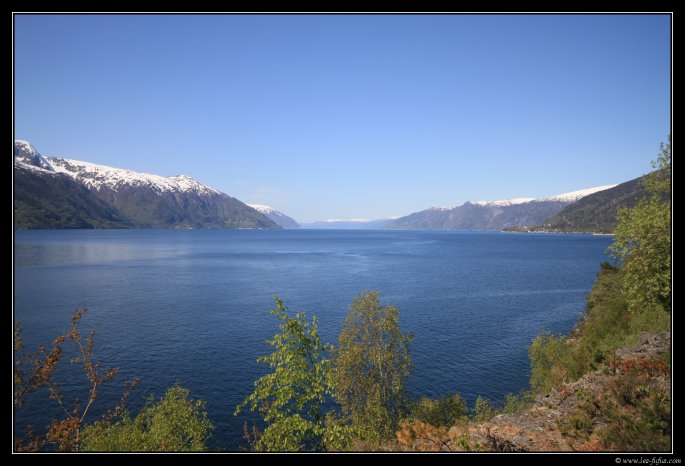 Il est déjà midi quand à la sortie du ferry, je bifurque sur la droite pour une dizaine de kilomètre afin de rejoindre un point de vue sur le Fjærlandsfjord. Une photo vaux mieux que tout un discours pour décrire la beauté du lieu.