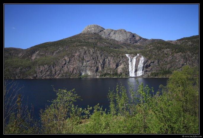 Je bifurque pour le nord et la ville de Dale. Les paysages sont jolis, mais la Norvège m’a habitué à mieux. Je fais un arrêt à la cascade Harefossen : très belle, très large !