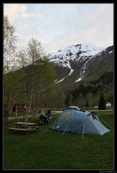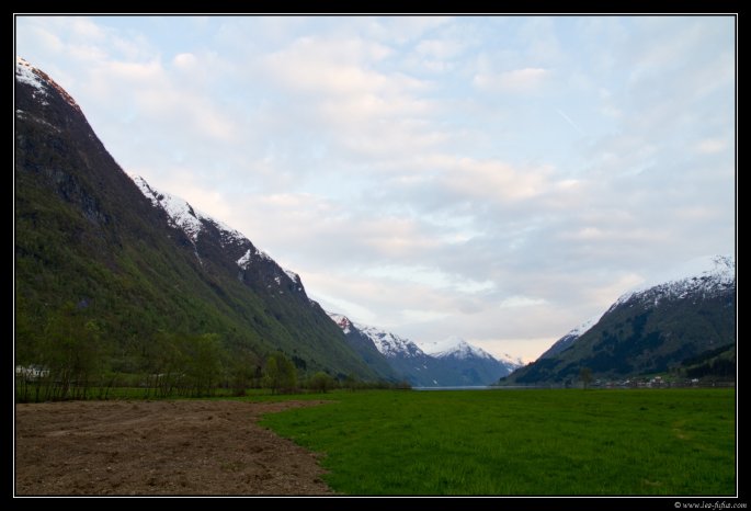 Puis j’atteins la grande ville de Førde. Là, je peux dire tout simplement que je n’aime pas. Trop de monde, des bâtiments partout, ca bouchonne, on n’avance pas … Beurk !!! Mais rapidement, on quitte l’agglomération et on retrouve les grands paysages avec ses grand lacs et ses hautes montagnes. J’atteins la région de Sogndal Fjordane.