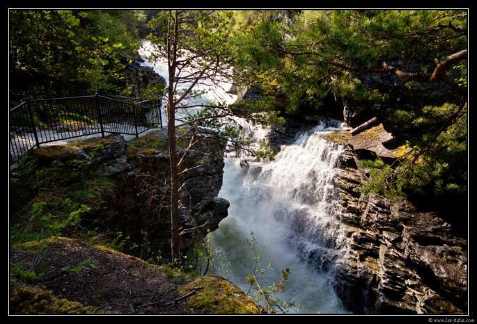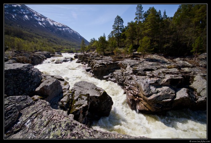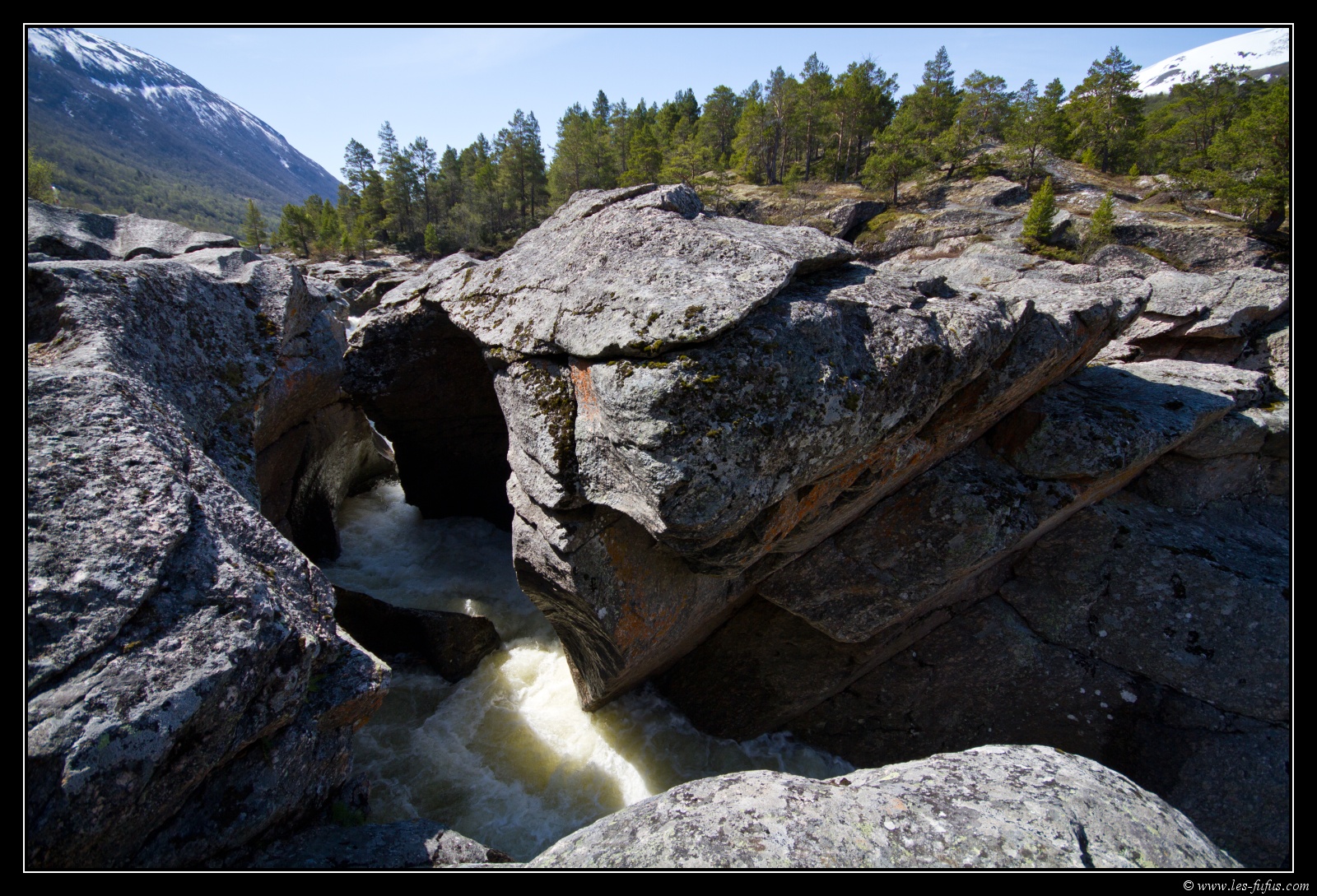 La descente sur Oppdal est sans réel intérêt. Un seul lieu mérite un arrêt : Måggålaupet. C’est une sorte d’étranglement, où une rivière de 20m de large doit se frayer un chemin dans un goulot de 3m. Forcément … ça coince