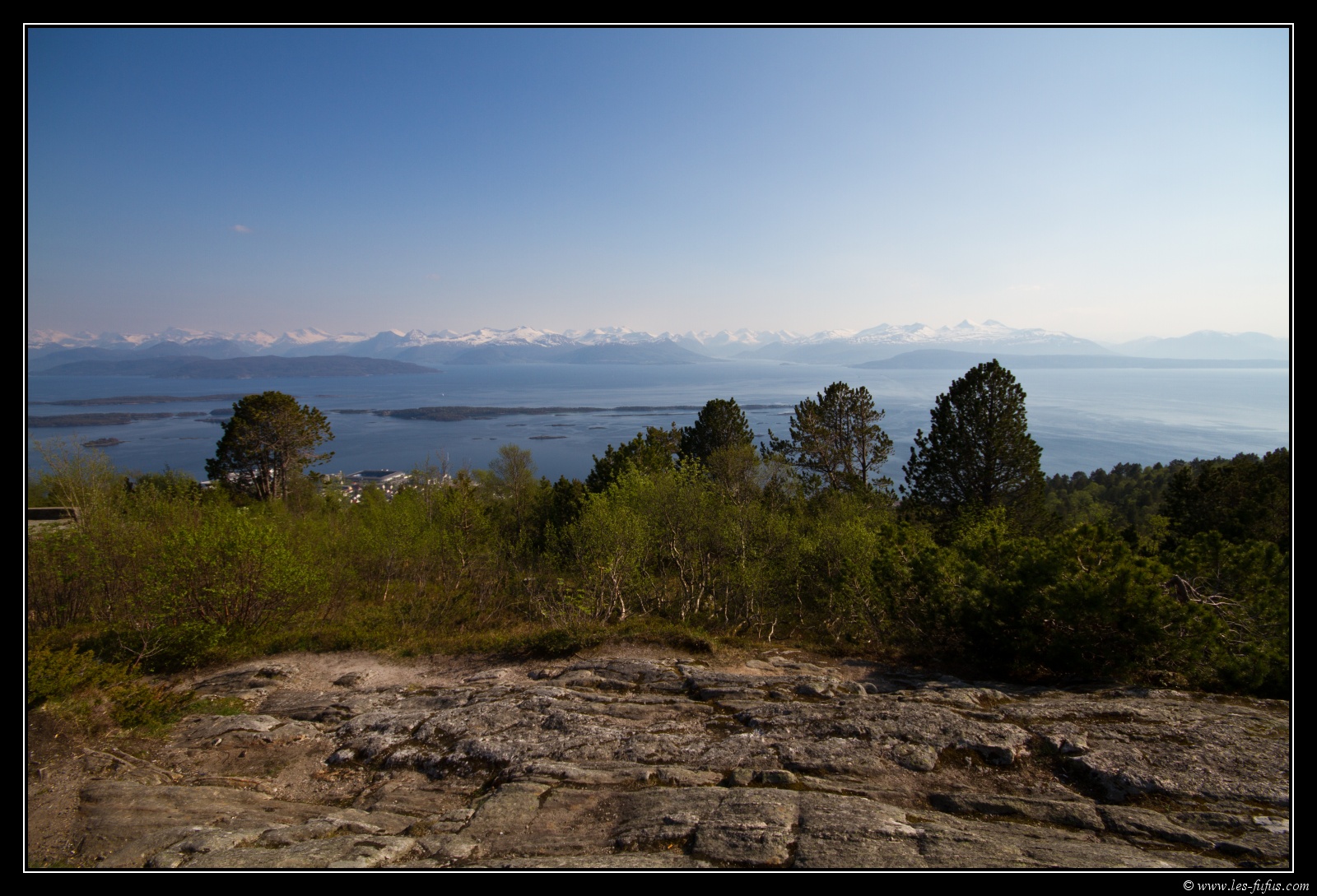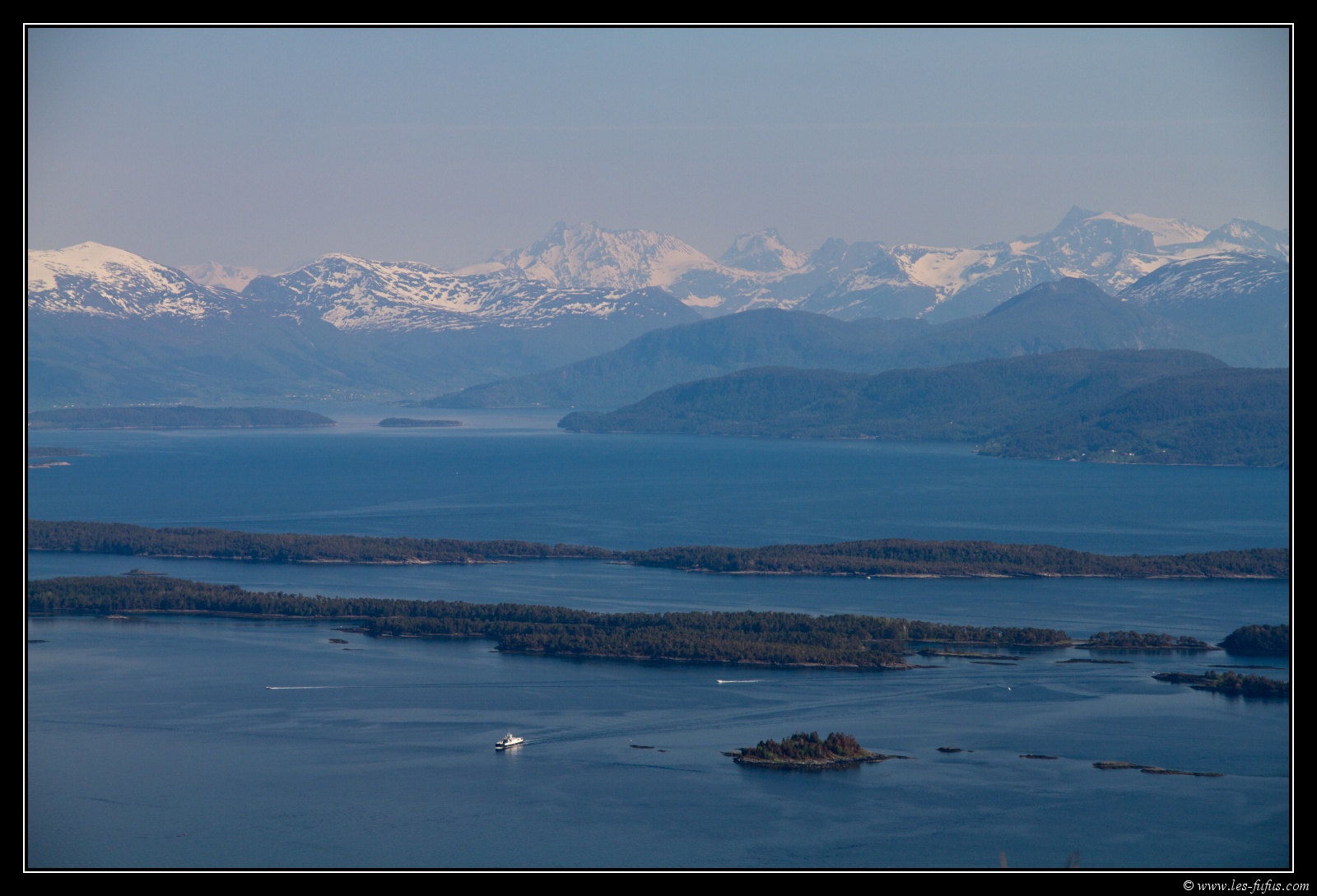Au premier plan, Molde, en deuxième plan, les iles et les fjords et au loin, les montagnes enneigées !! Je ne me lasse pas de la vue ! Allez voir aussi dans la section panorama.