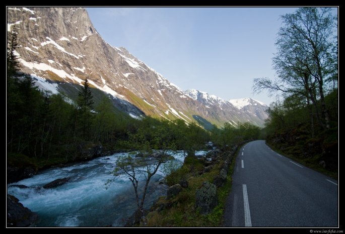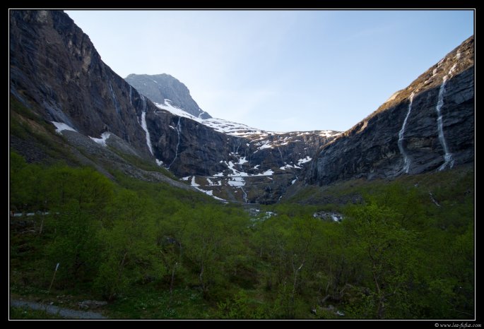 Je me lève vers 6h30 – je n’ai pas sommeil aujourd’hui. Après ma petite heure de préparation, j’entame la route rejoignant le début de la « route des Trolls » (lien Wikipédia). Elle est toujours fermée (notamment à cause des très nombreuses avalanches) mais je voudrais tout de même voir ces fameux lacets. Après un quart d’heure, me voila au fond de la vallée face à d’imposantes murailles et la célèbre route qui les escalade.