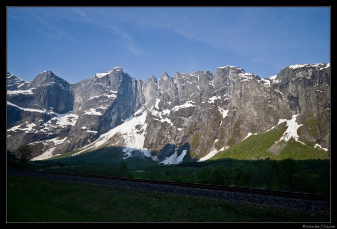 Je renfourche ma moto et reviens sur mes pas, avant de bifurquer dans la vallée rejoignant la ville de Dombas. Quelques kilomètre plus loin, je longe le célèbre « mur des Trolls» (lien Wikipédia). Il faut s’imaginer le panorama : c’est la plus haute paroi rocheuse d’Europe, avec plus de 1100m de dénivelé !!!!