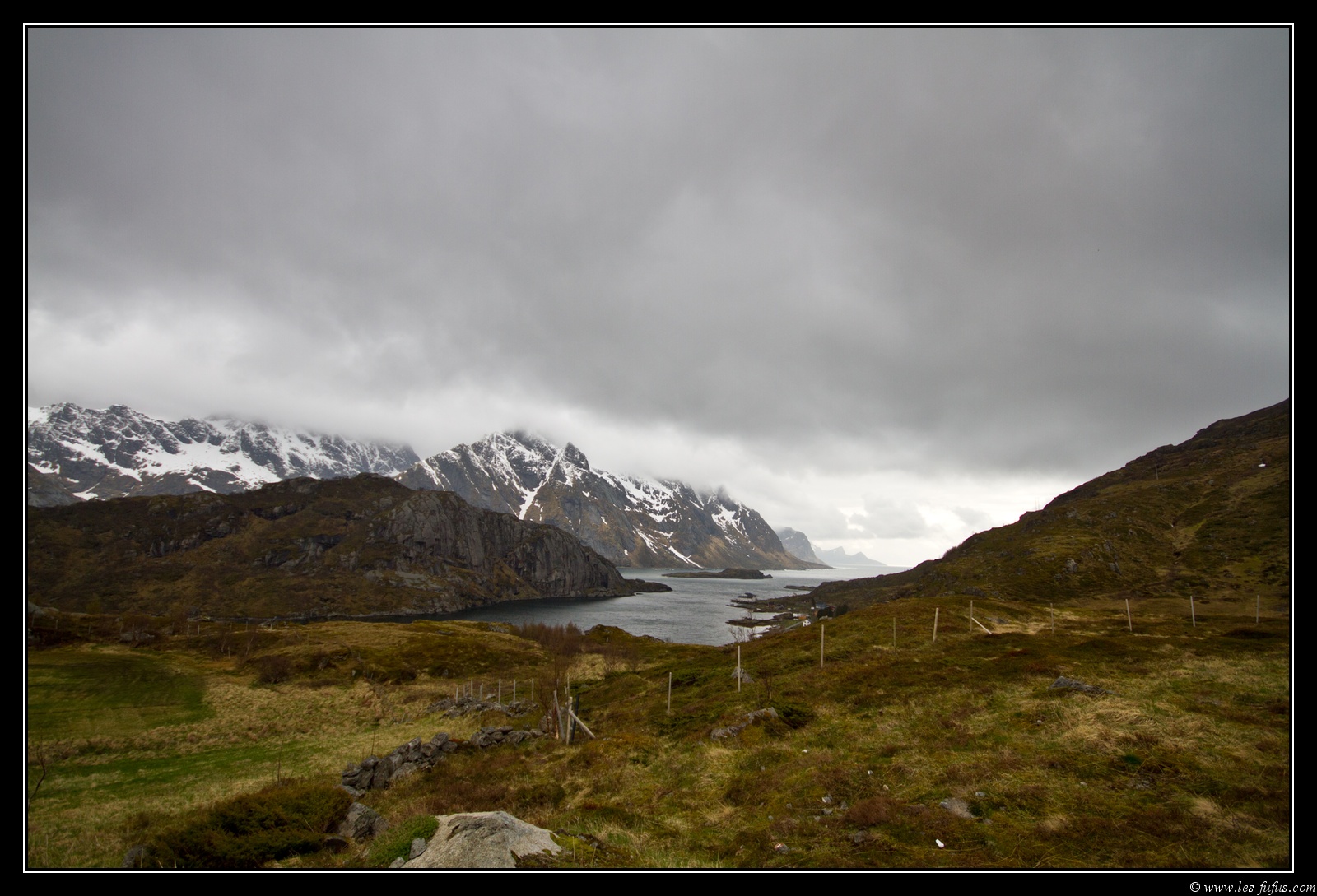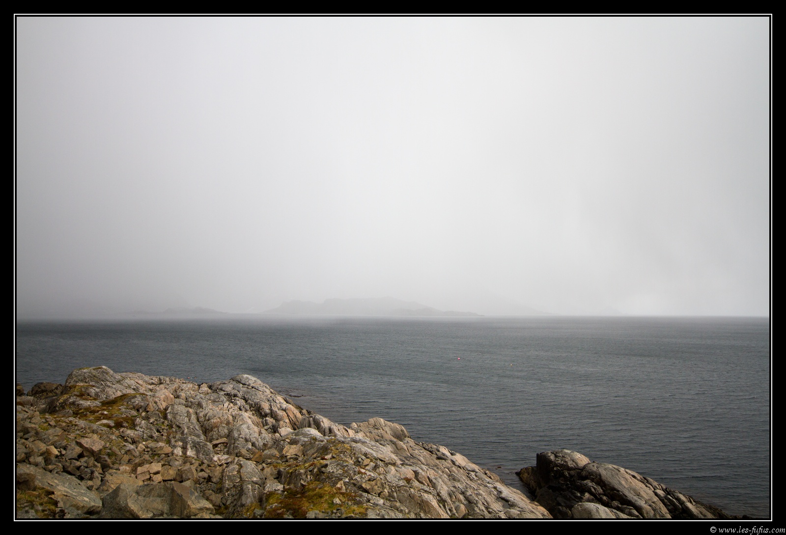 J’ouvre ma tente, et c’est la déception. Les nuages sont bas, il n’y a aucune visibilité, aucune couleur. Je suis dépité et amer. Je me faisais une joie de visiter les Lofotens et il semble bien que je vais passer à coté de tout.