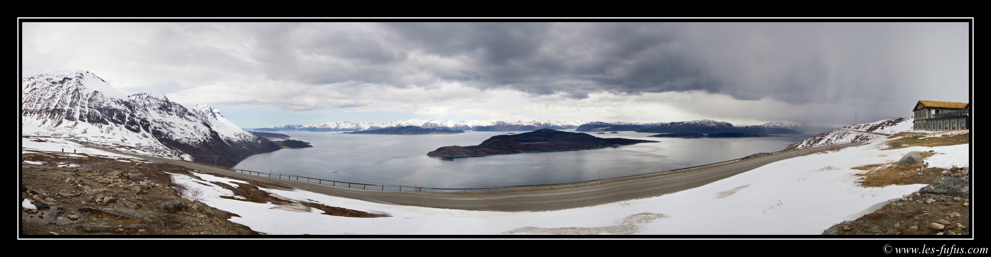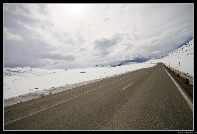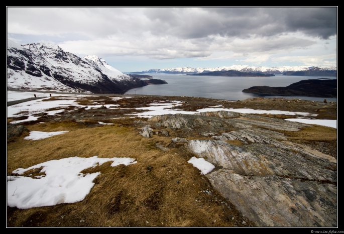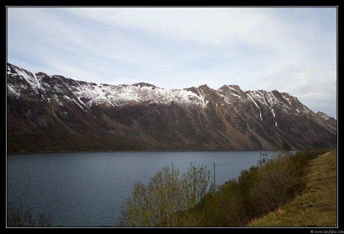 J’essuie ma première averse de la journée dans le petit fjord Kåfjorden. Mais je sèche rapidement. La route E6 déroule rapidement son ruban sous mes roues. Désormais, la neige est présente régulièrement et il commence même à y avoir des congères au niveau des fjords. Je quitte l’Oksfjorden et monte dans une montagne