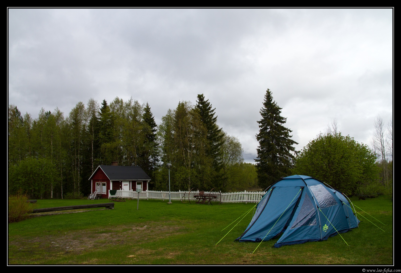 Puis je bifurque sur l’E5 vers l’Est. Quelques nuages se forment et il commence à pleuvoir légèrement. En chemin, je m’arrête à une sorte de camping pour caravane. Il n’y a aucun client et le patron me laisse m’installer pour un prix correct. Je peux même aller faire du canoë gratuitement … à voir …. Il pleuvine de temps en temps.