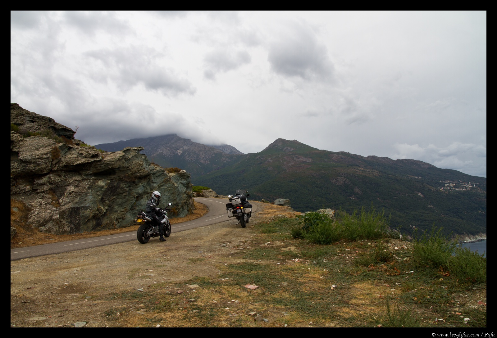 Le temps est maussade. Frissonant, nous décidons de faire une pause, surtout après l’averse que nous traversons tout de suite après le col. On trouve un petit troquet typiquement corse en bordure de route. Le panorama est très beau et la nourriture sympa (« hamburger » de sardines à la brousse et aux épinards, suivi d’une tartelette chocolat caramel maison pour Guillaume