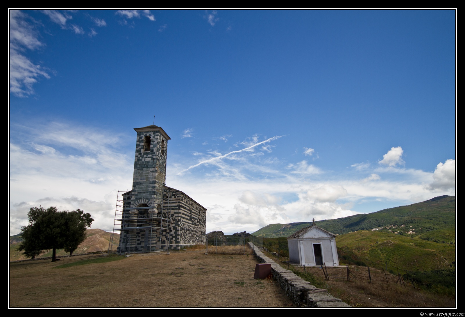Nous reprenons la route et quelques kilomètres avant le village de Ponte Leccia, nous bifurquons sur une route secondaire qui nous emmène sur les hauteurs. Par moment le macadam est nickel, d’autrefois, ce n’est qu’un vaste champ de nid de poule. Une seule constante : la route n’est guère plus large qu’une piste cyclable et les bords donnent sur d’impressionnants précipices. Heureusement, la route est peu utilisée et on ne croisera quasiment aucune voiture. On passera par quelques villages typiquement corses, accrochés à flanc de montagne.