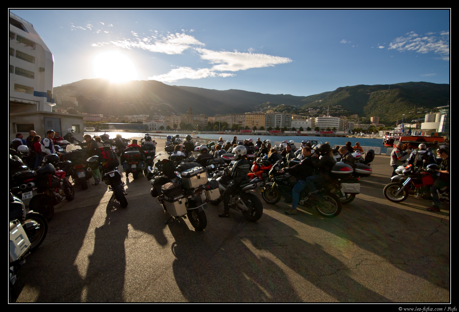 On enfourche nos motos pour la dernière étape : Bastia et son port. On y est très rapidement et nous devons faire face à la circulation dense de la ville : on avait un peu oublié comment ça se passait dans des villes un peu plus importantes. On arrive au Port et en attendant l’embarquement, on va boire un verre.