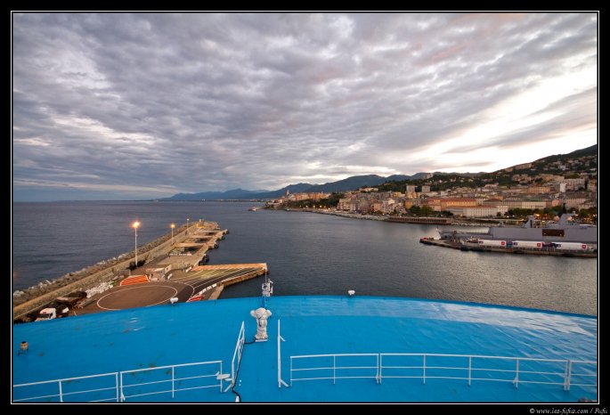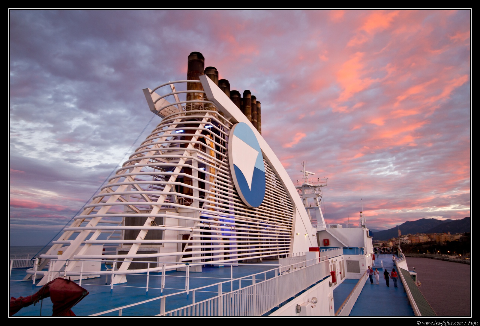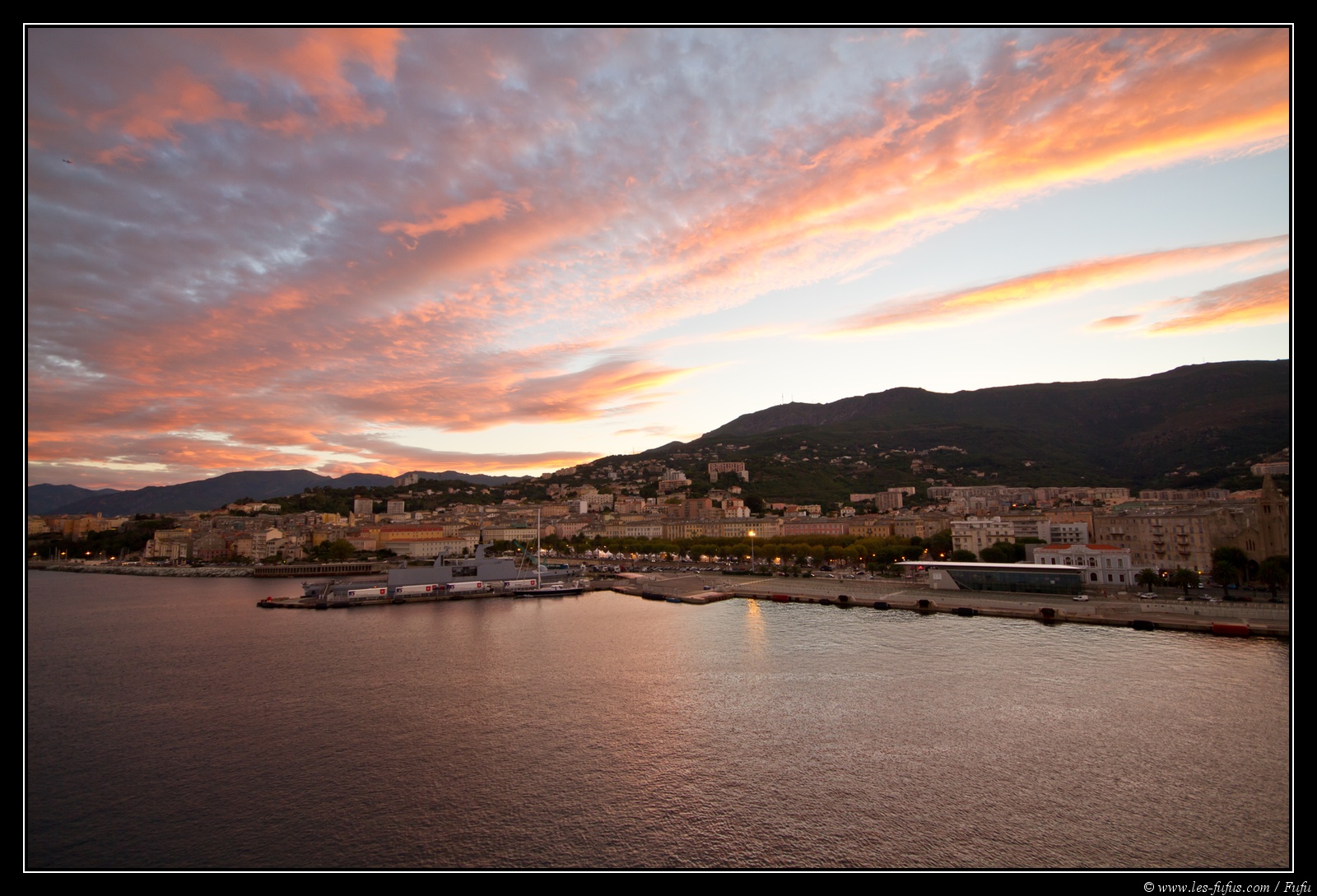 Pour le départ, nous montons sur le dernier pont. Le soleil se couche sur Bastia en une explosion de couleur.