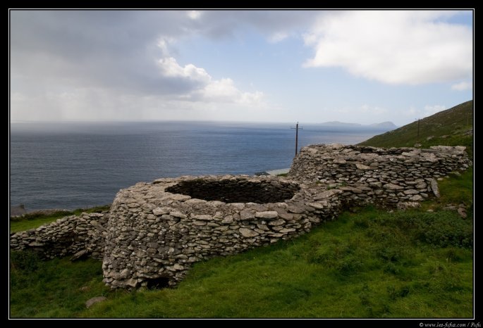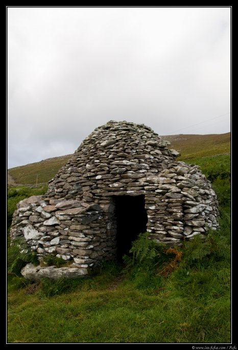 Ces cabanes de forme circulaire en pierres sèches sont déjà mentionnées dans la loi Críth Gablach du VIIe au VIIIe siècle, mais leur construction remonte au Ve siècle, par les moines disciples de saint Patrick. On verra les plus beaux exemples de ces habitations 2 jours plus tard, avec notre visite sur l'ile de Skellig Michael.