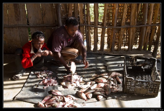 Toute une économie tourne autour de cette activité. Même les enfants sont mis à contribution, comme ces gamins chargés d’arracher la peau des filets avec leurs dents.