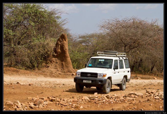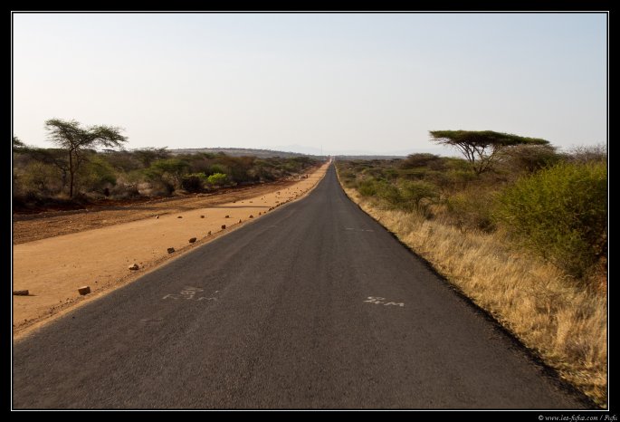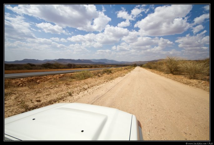 Nous roulons pendant une bonne heure et demie sur une route difficile. Cette route est celle qui rejoint le Kenya. Elle est en cours de réfaction, et pour se faire, ils ont détruit l’ancienne route. Ainsi durant les travaux, les véhicules empruntent une nouvelle piste en terre, parallèle à la future route. Ils aurait mieux fait de laisser l’ancienne route et de construire la future route à coté.