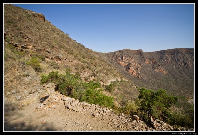 On passe en mode rando : pour 40 minutes de descente, on chausse les bonnes chaussures et on s’élance. On sait que la remontée va être dure ! La descente est escarpée par endroit et le sol rocailleux et instable.