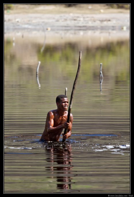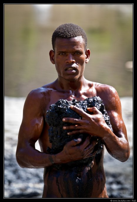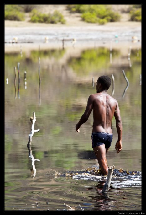 A l’aide d’un bout de bois, ils arrachent la vase et la remontent à la surface. L’eau est extrêmement acide, et détruit les yeux, le nez, les oreilles, etc… des travailleurs. Beaucoup nous montreront l’état déplorable de leurs jambes, dont chaque petite blessure est rongée par le sel.