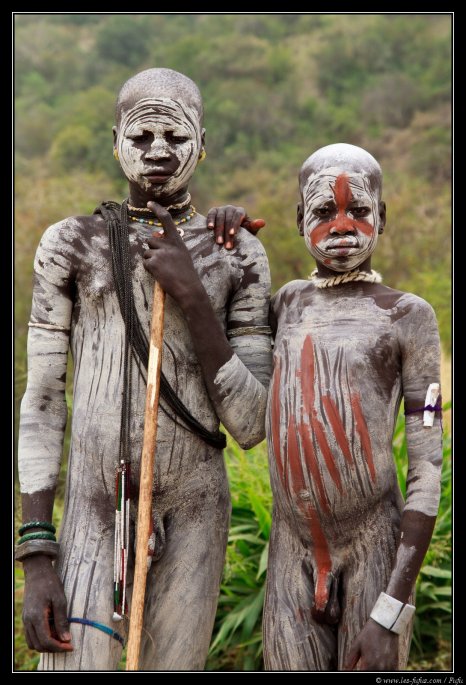 Arrive enfin la remontée dans les montagnes, en territoire Mursi. On récupère un garde armé et un peu plus loin, on rencontre les premiers habitants : 2 adolescents le corps entièrement peint.