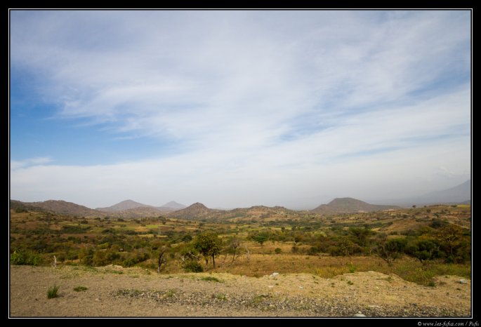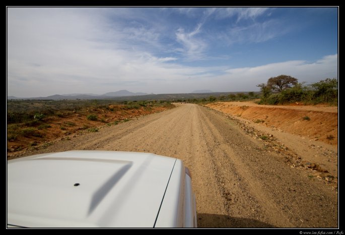 Après le petit déjeuner, on lève le camp et on quitte l’hôtel vers les 9h du mat’. Nous reprenons la même route qu’il y a 2 jours, mais en sens inverse. Après une quarantaine de kilomètres, on bifurque sur une route en terre à notre droite. Nous sommes ici en pays Hamer.