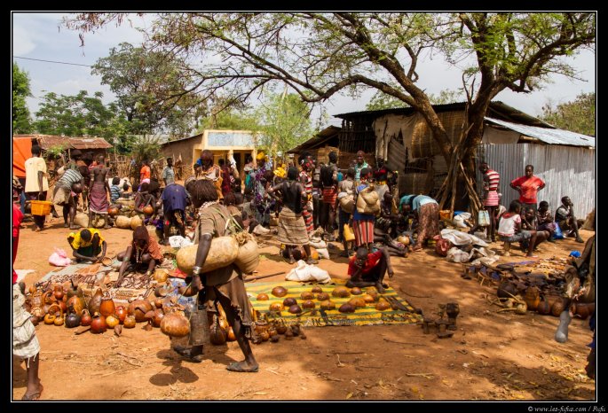 Nous rejoignons la ville de Dimeka connue pour son marché local bihebdomadaire. A l’association locale, on loue les services d’un guide local (qui saura se montrer intéressé et nous fera découvrir les us et coutumes de son peuple) et nous explorons le marché. Tout d’abord, en contrebas de la ville se trouve la rivière, où de nombreux Hamers se lavent dans l’eau. La plupart profite de leur venue en ville pour se faire « beau ». Il est aussi à noter que les hommes ne sont absolument pas pudique … et non mesdames, je n’ai pas fait ce « genre » de photo