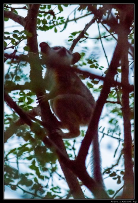 A la tombée de la nuit, sur le chemin qui rejoint le restaurant, nous ferons une jolie découverte dans un arbre. Si je ne me trompe pas (envoyez-moi un email si vous avez plus d’information), je crois bien que c’était un Somali Galago (lien Wikipédia). J’essayerai tant bien que mal de faire des photos. Il fait quasiment nuit noir, et il court de branche en branche. Mais il est quand même super mignon avec ses grands yeux tout ronds.
