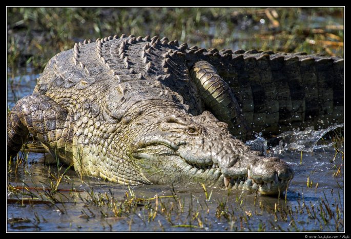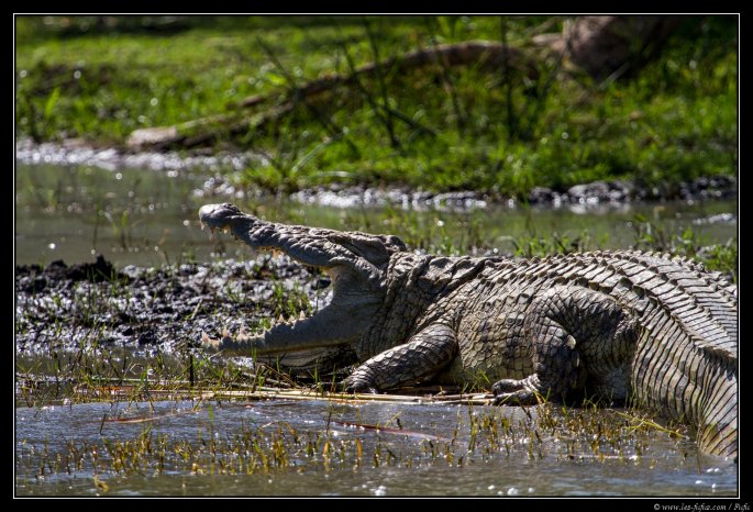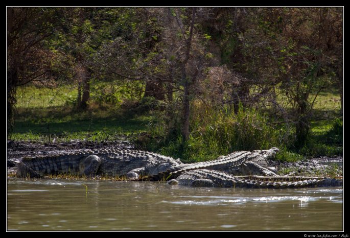 Ils peuvent contenir une quinzaine de personne, mais nous sommes seul à bord. Nous quittons le frêle embarcadère et filons droit sur la rive opposée au lieu dit « le marché aux crocodiles ». Ils sont là, une vingtaine de sauriens, en train de se chauffer au soleil. A notre arrivée, peu à peu, ils glisseront lentement vers l’eau et s’éloigneront un peu. On arrive à s’approcher au plus prés, à seulement 1 ou 2 mètres de certains.