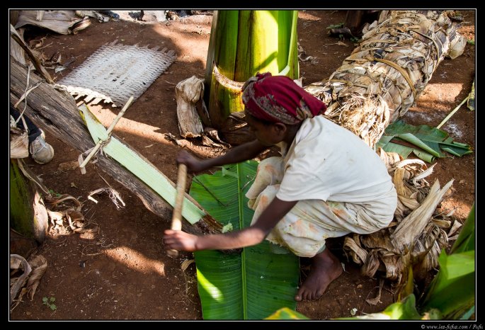 On enterre cette pulpe sous terre en la recouvrant de feuilles, et ceci pour 3 mois afin que la fermentation se fasse. Et ensuite, on en récupère une partie que l’on tranche finement afin de découper les fibres de la plante.