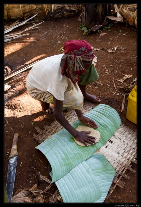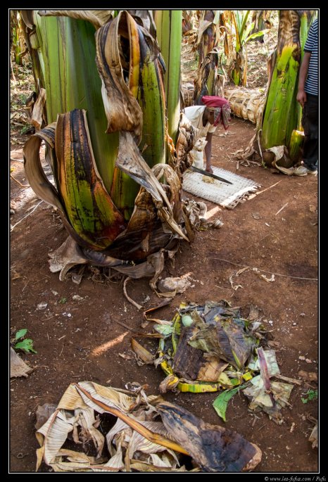 Ensuite, nous allons dans le jardin où une jeune fille nous expliquera comment préparer une sorte de pain qui constitue une des bases de leur alimentation. Tout d’abord, on racle les feuilles de faux-bananiers pour récupérer la pulpe.
