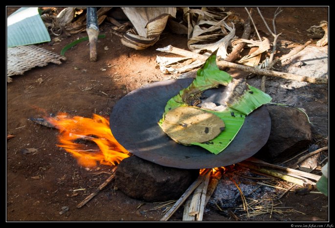 Il ne reste plus qu’à faire une galette entre 2 feuilles de faux-bananiers et à la cuire.
