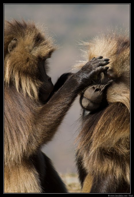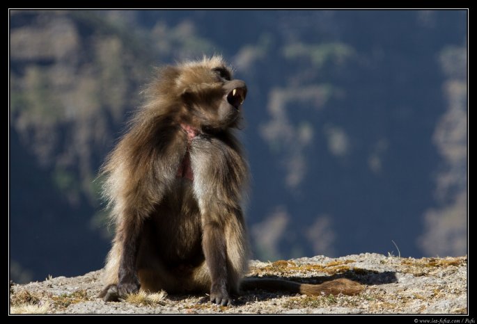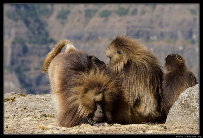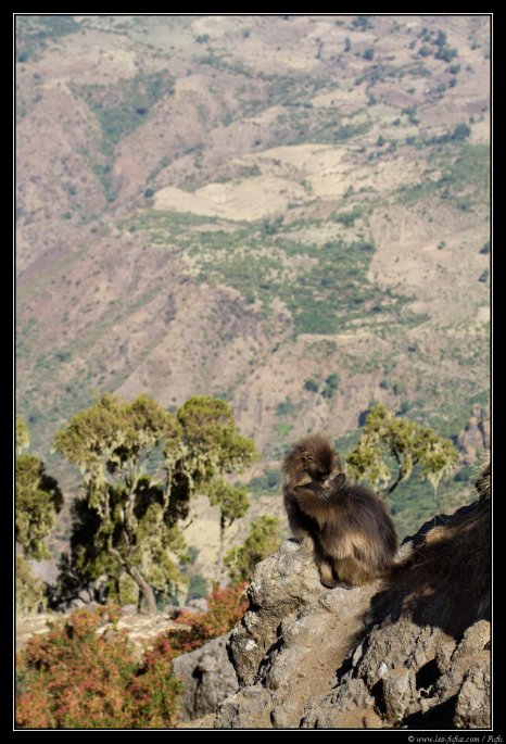 Et bien sur la faune avec l’immanquable babouin gelada, aisément reconnaissable à sa fourrure et sa poitrine rose. Il y a des centaines d’individus peu craintifs : on peut s’approcher sans risque à 3-4m. Cela permet de gros plans. Il passe leur temps à se chercher des poux et à ramasser des graines au sol.