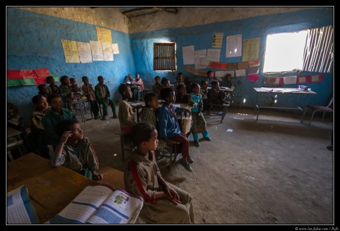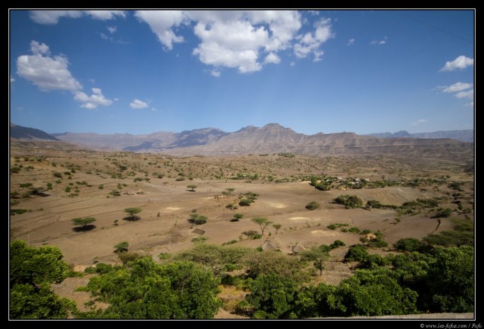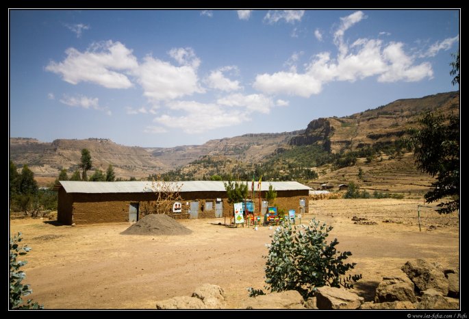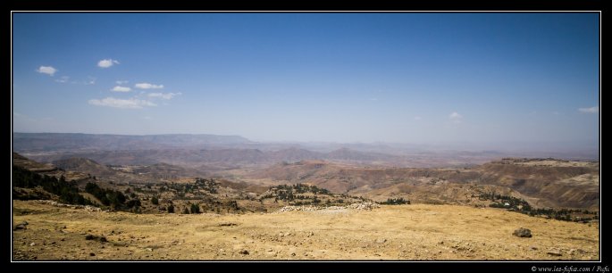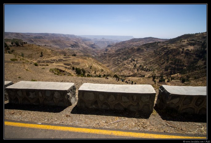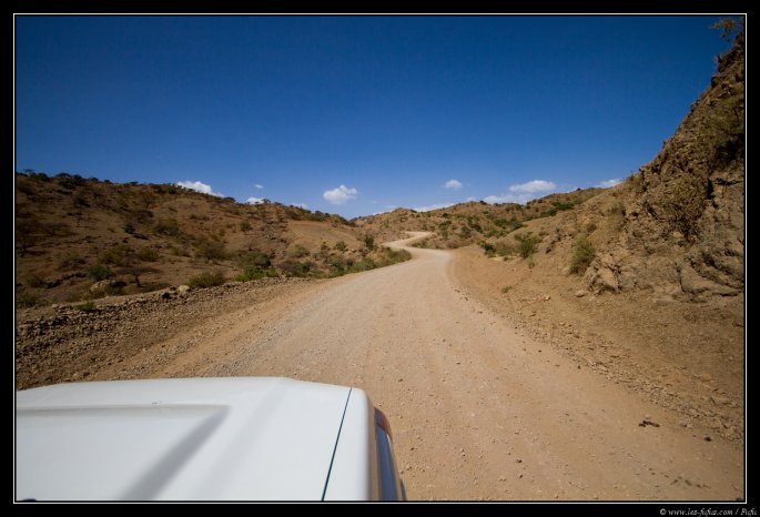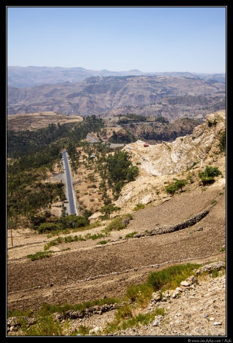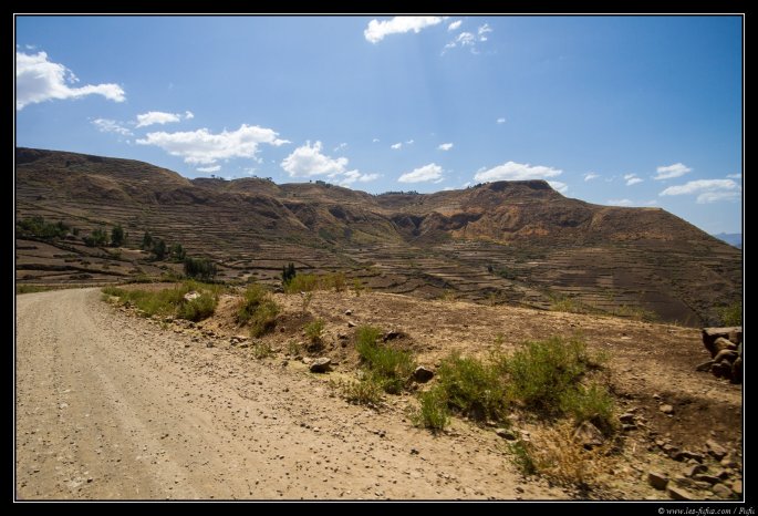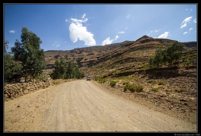 On reprend la route et nous bifurquons vers le nord et notre destination finale, Lalibela. Le bitume fait place à une étroite route en terre. On descend du plateau et la température grimpe en flèche au plus grand bonheur de Sabine. La région que l’on traverse désormais est très aride et pauvre. La terre est de très mauvaise qualité et les champs ne sont remplis que de caillou, rendant difficile toute culture. C’est ici qu’il y a parfois des famines.
