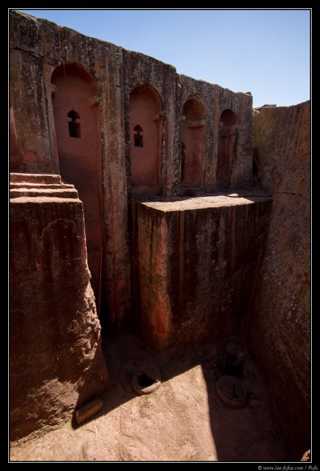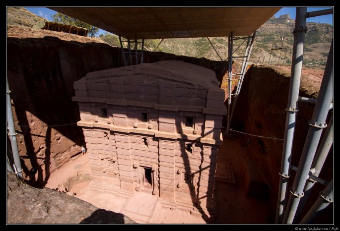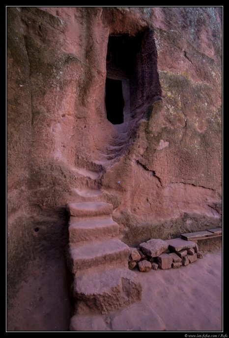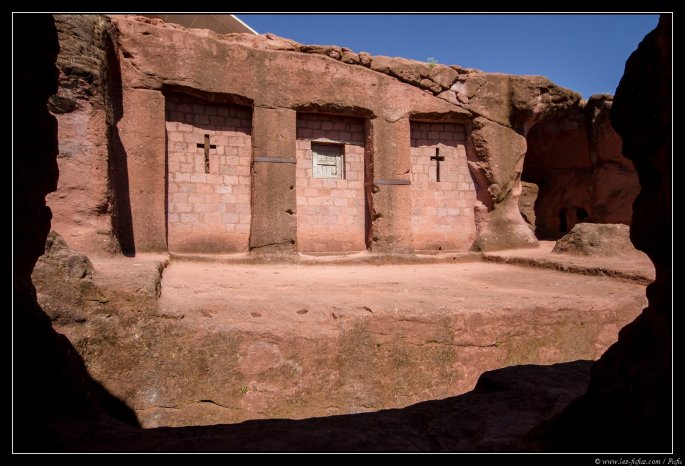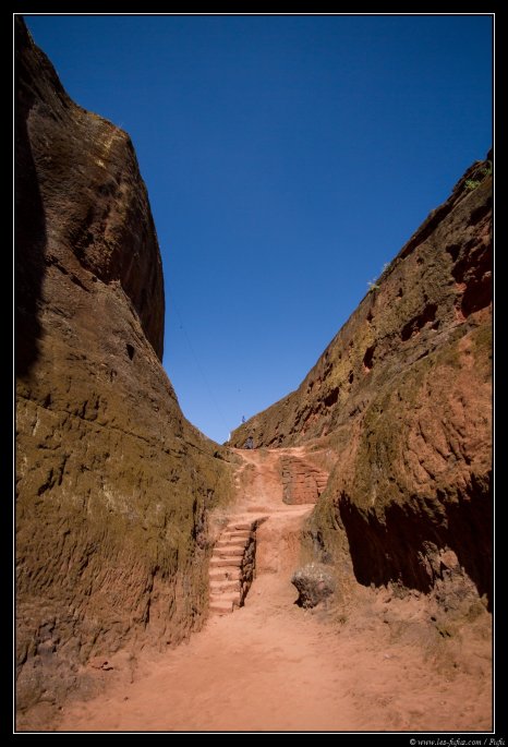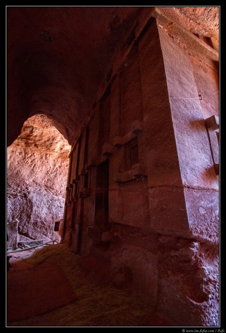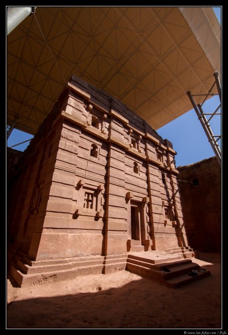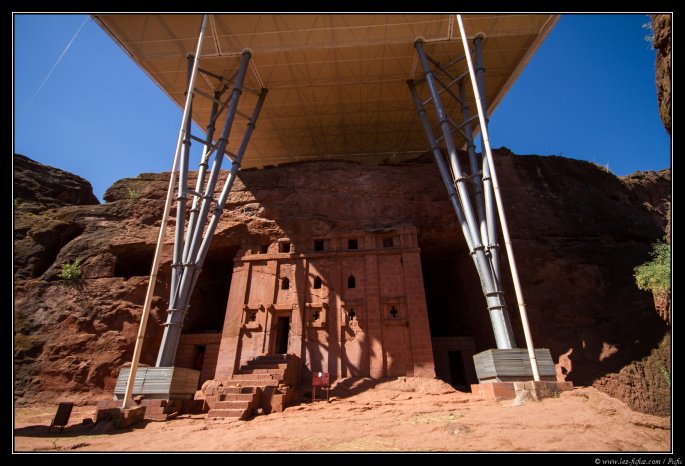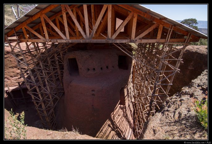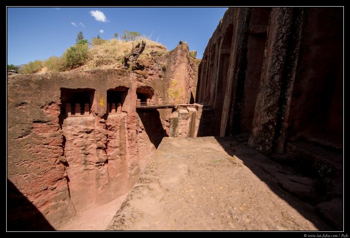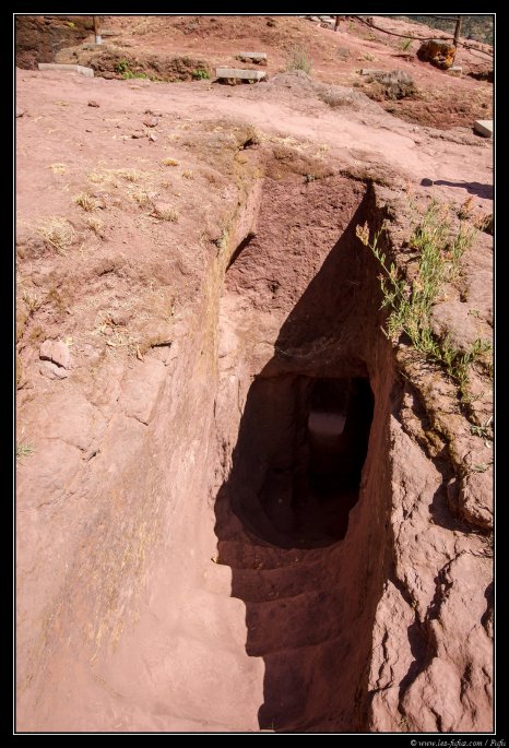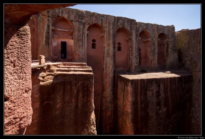 Nous ressortons sur la quatrième et dernière église, Bet Abba Libanos (lien Wikipédia). Cette dernière est complètement excavée et ne tiens à la roche plus que par son plafond et son sol. De l’extérieur, on a juste l’impression qu’elle ne possède qu’une façade.